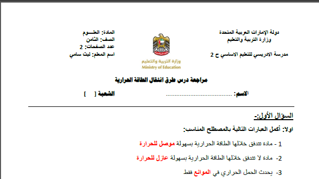 ورقة عمل انتقال الطاقة الحرارية الصف الثامن علوم الفصل الأول 2017 2018 المناهج الإماراتية