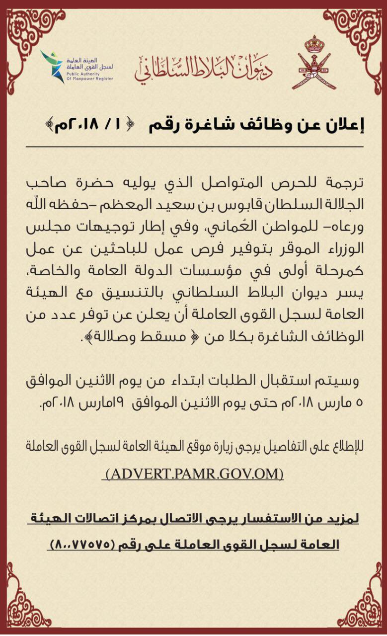 المركز الوطني للتشغيل على تويتر ديوان البلاط السلطاني يعلن عن عدد من فرص العمل بالتنسيق مع الهيئة العامة لسجل القوى العاملة ابتداءا من يوم غد الاثنين ٥ مارس حظا موفقا لابنائنا الباحثين