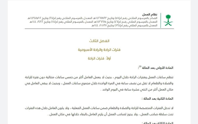 نظام العمل السعودي On Twitter ١ لا يجوز ان يعمل العامل أكثر من خمس ساعات دون فترة للراحه والصلاة والطعام لا تقل عن نصف ساعة في المرة الواحدة خلال مجموع ساعات العمل