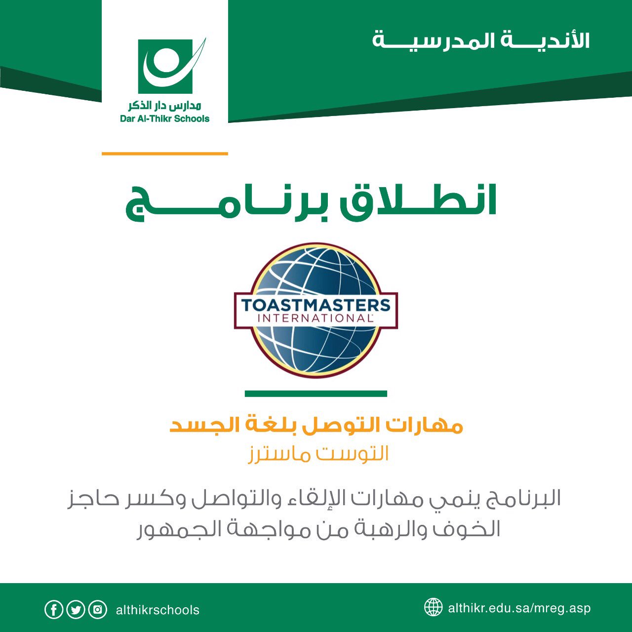 مدارس دار الذكر الأهلية En Twitter انطلاق نادي التوست ماسترز بجميع المراحل الابتدائية المتوسطة الثانوية البرنامج يمتد ل 8 أسابيع بمجموع 18 ساعة Toastmasters School Toastmasters مدارس التعليم علم تعلم